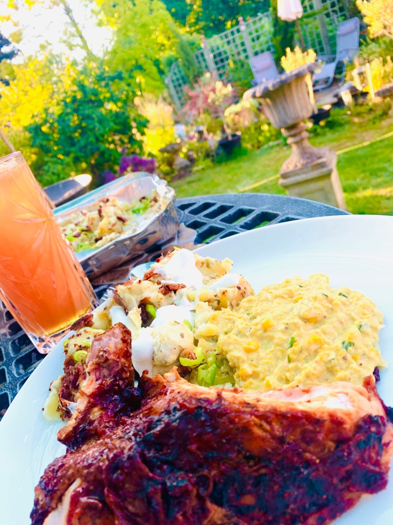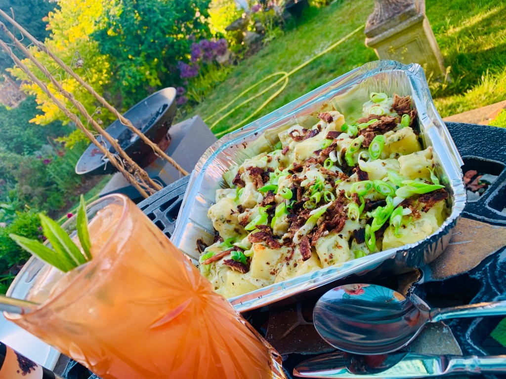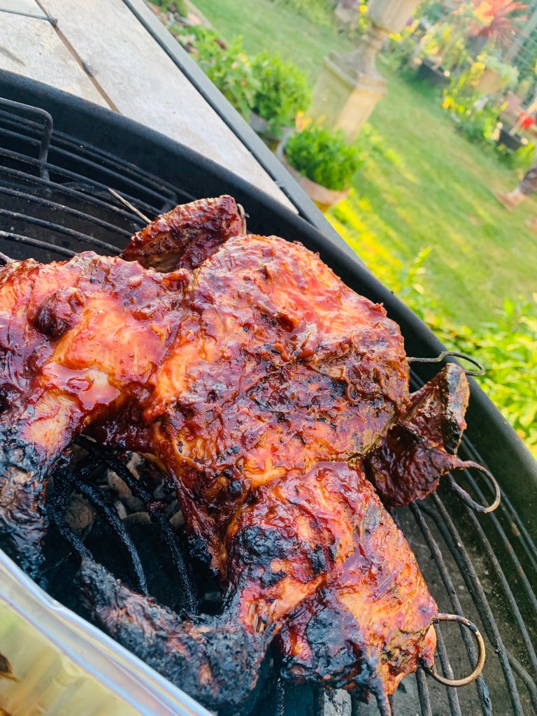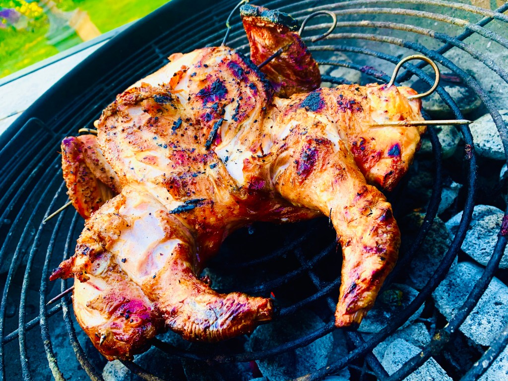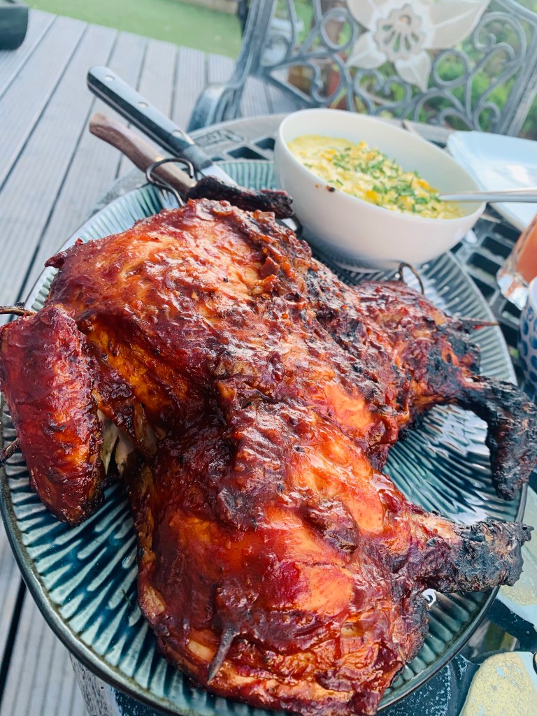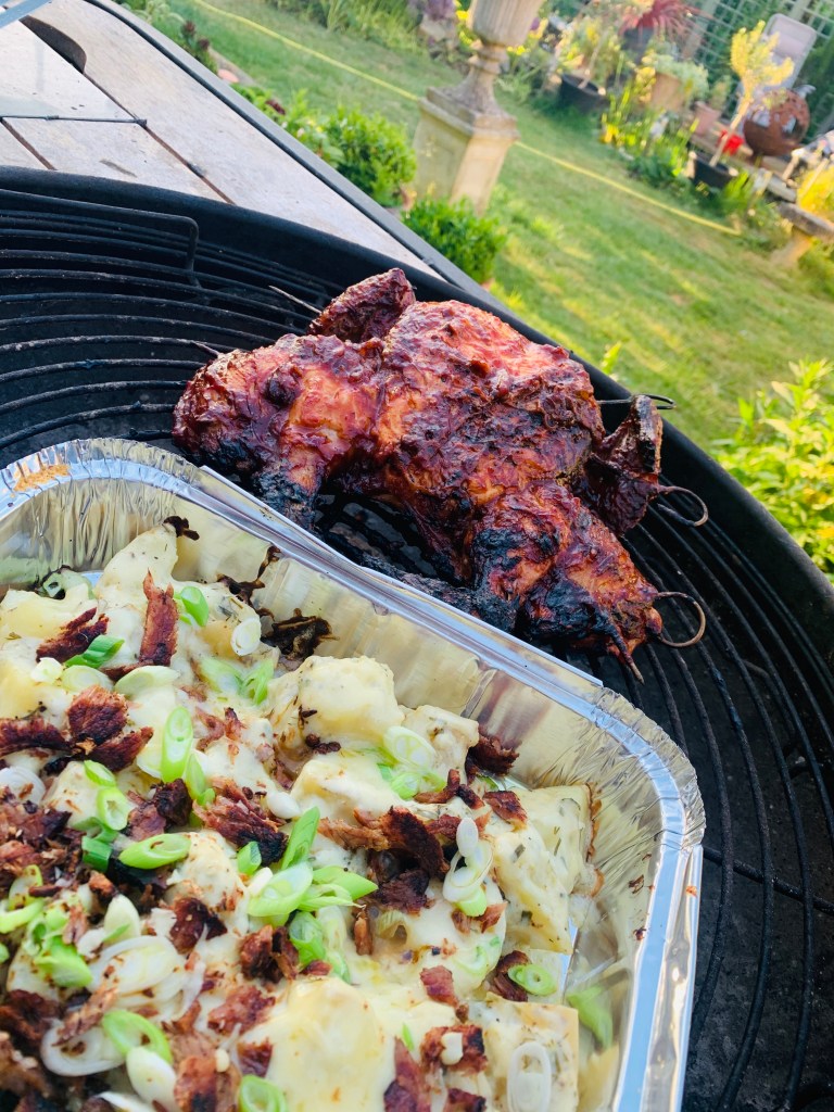 Preheat bbq to around 180’c degrees, I use charcoal, I arrange my white coals in a gradual slop in the base of the bbq to get a low, medium and hotter heat, instead of flat. I skewer my chicken so as to make it easier to turn over, this is up to you if you want to do this. Rub your chicken with olive oil, salt and pepper. I used soaked bbq wood chips (mesquite) because I love the smoky bbq taste they add. Cook the spatchcocked chicken for 15 minutes with the lid/cover over the bbq on the medium heat part of the bbq, skin side down first and then turn and cook for a further 10-15 minutes. Now take your bbq glaze and brush liberally over the chicken and place sauce side down and cook for a further 5 minutes, glaze other side and cook again for 5 minutes, keep glazing and turning every 5 minutes for 15-20 minutes until chicken is cooked and juices from the legs run clear. Place your potatoes on now if cooking. *see below.