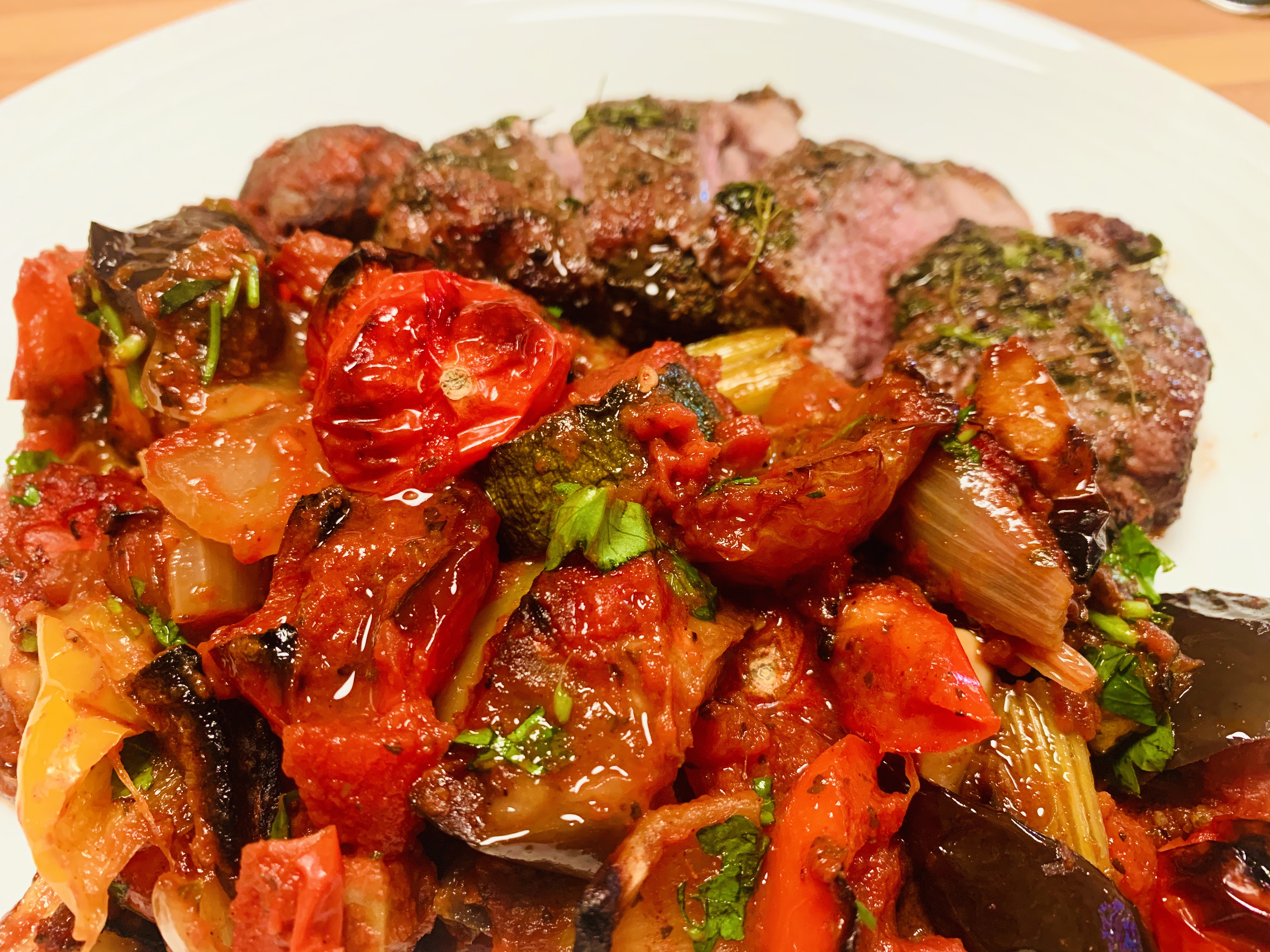 Remove from oven and add fresh herbs and lemon juice snd stir gently. Check seasoning and serve. I served mine with lamb steaks.
